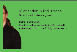 Lige nu er jeg ved at uddanne mig til grafisk designer på SDE (syddansk erhvervsskole), jeg har bestået grundforløb 2 og skal derfor i skoleoplæringen mens jeg søger efter en læreplads. Jeg vil være færdig med min uddannelse i 2027 med en svendeprøve, hvis alt går efter planen. Jeg er kreativ, lærenem og nysgerrig på faget og på at prøve nye ting. Det, der motiverer mig, er at se et færdigt produkt som jeg kan være stolt af, men hele processen med at lave noget grafisk interessere mig også og jeg er parat til at finde ud af hvordan jeg kan optimere min egen fremgangsmåde. I min fritid er jeg spejder og det har jeg været i 8 år. Min tid som spejder har givet mig refleksionsevner og lært mig, hvordan man skal være vedholdende og tænke ud af boksen.